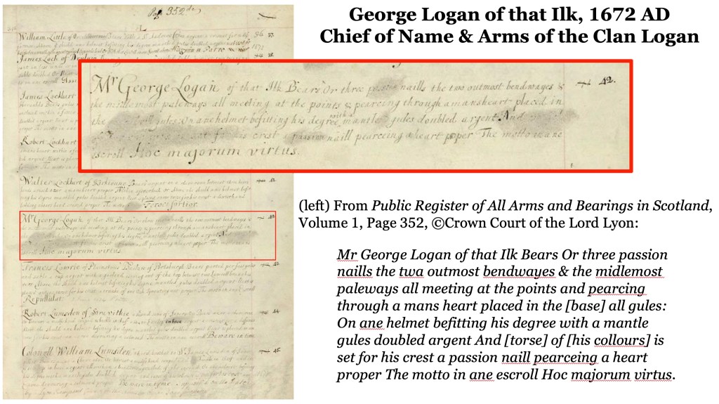 We owe George Logan of that Ilk a great debt in making it a priority to register his arms. His efforts in following the Act of 1672, and the meticulous record keeping of the Lord Lyon King of Arms since then, is what allows us to be petitioning now to have a Commander of the name Logan recognized by the Lord Lyon.